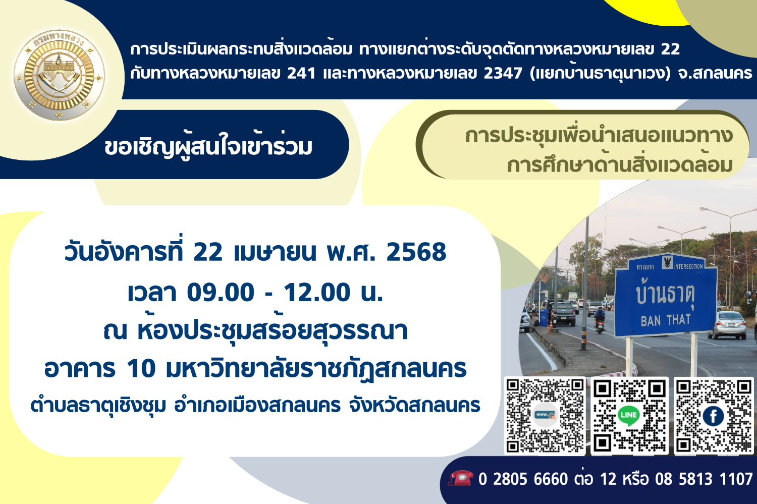 ตามที่ กรมทางหลวง ได้ว่าจ้างกลุ่มบริษัทที่ปรึกษา ประกอบด้วย บริษัท เอเซีย แล็ป แอนด์ คอนซัลแตนท์ จำกัด และบริษัท อินเทลแพลน จำกัด ให้ดำเนินการศึกษาการประเมินผลกระทบสิ่งแวดล้อม ทางแยกต่างระดับจุดตัดทางหลวงหมายเลข 22 กับทางหลวงหมายเลข 241 และทางหลวงหมายเลข 2347 (แยกบ้านธาตุนาเวง) จ.สกลนคร นั้น