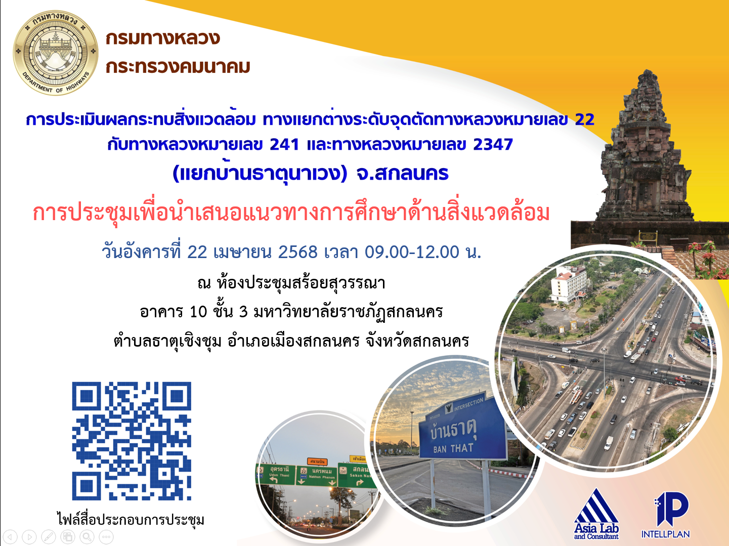 ตามที่ กรมทางหลวง ได้ว่าจ้างกลุ่มบริษัทที่ปรึกษา ประกอบด้วย บริษัท เอเซีย แล็ป แอนด์ คอนซัลแตนท์ จำกัด และบริษัท อินเทลแพลน จำกัด ให้ดำเนินการศึกษาการประเมินผลกระทบสิ่งแวดล้อม ทางแยกต่างระดับจุดตัดทางหลวงหมายเลข 22 กับทางหลวงหมายเลข 241 และทางหลวงหมายเลข 2347 (แยกบ้านธาตุนาเวง) จ.สกลนคร นั้น